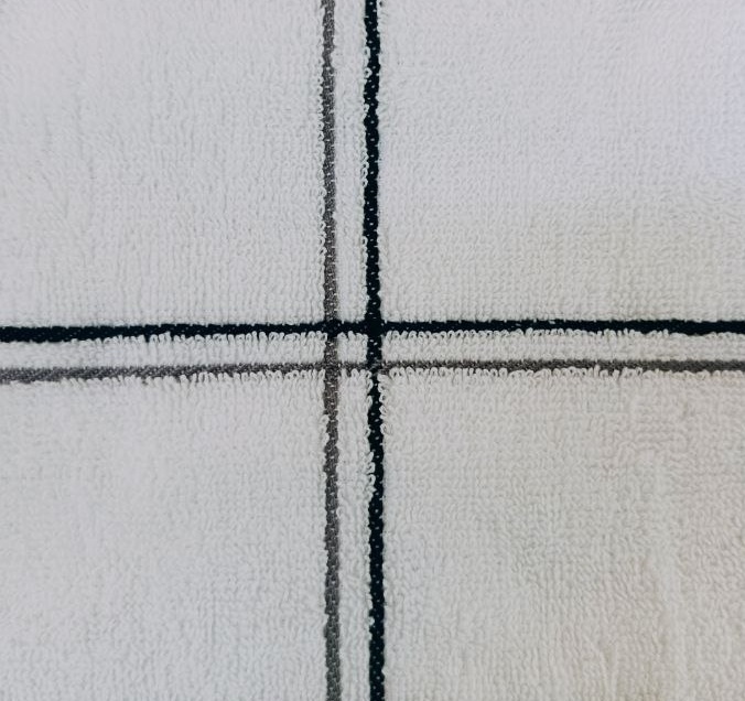 Цвет: белый основной цвет, тонкая клетка из чёрных и серых полос.